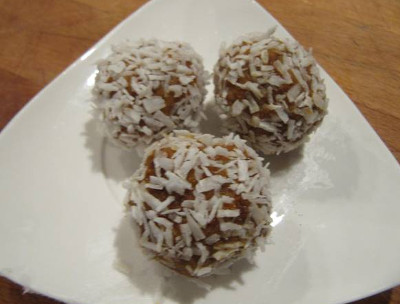 Das Kokosöl bei maximal 40 Grad im Wasserbad schmelzen und untermischen. Kleine Kugeln formen und in den Kokosraspeln wälzen. Fertig!
